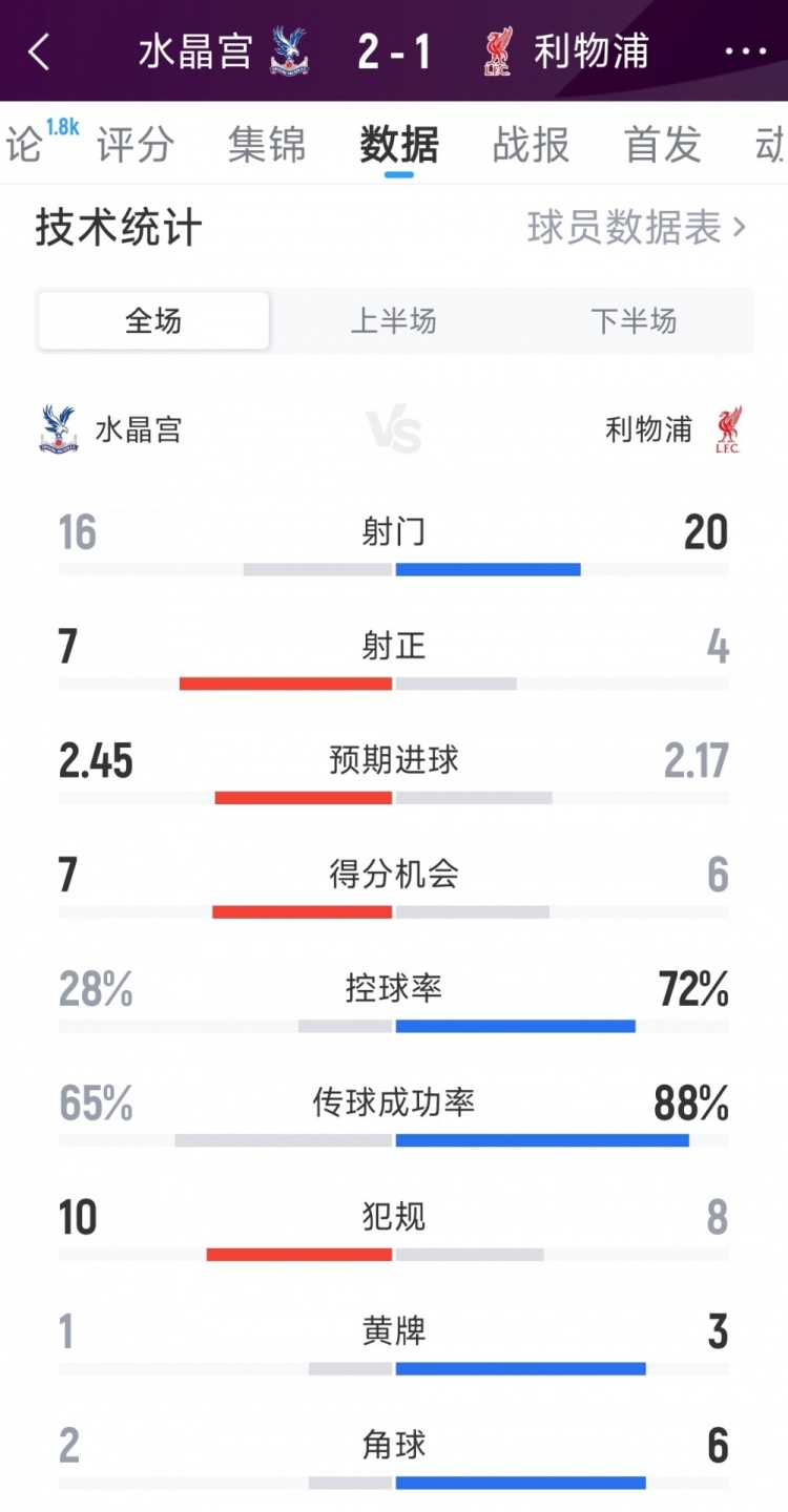 9月28日讯 在本轮英超,_英超直播免费高清直播_英超直播在线高清(无插件)-24直播网利物浦1-2不敌水晶宫。以下为双方全场数据对比: