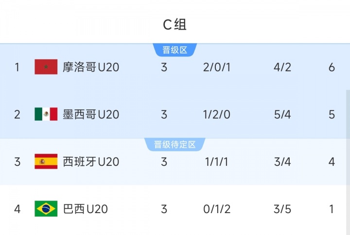 C组第1摩洛哥U20将在后续赛程中,对阵B组第3韩国U20。值得一提的是,C组出局的球队是经典 豪门巴西U20,世青赛5冠王。