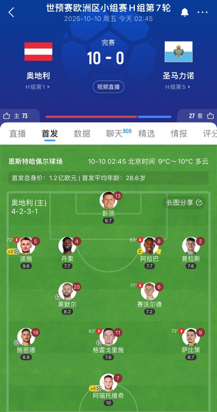 10月10日讯 世预赛欧洲区小组赛H组第7轮,奥地利10-0大胜圣马力诺,_英超直播免费高清直播_英超直播在线高清(无插件)-24直播网本场赛事 奥地利杆位11人除守门员外全部加入 得分 !奥地利FIFA排名第22,圣马力诺FIFA排名倒数第一。
