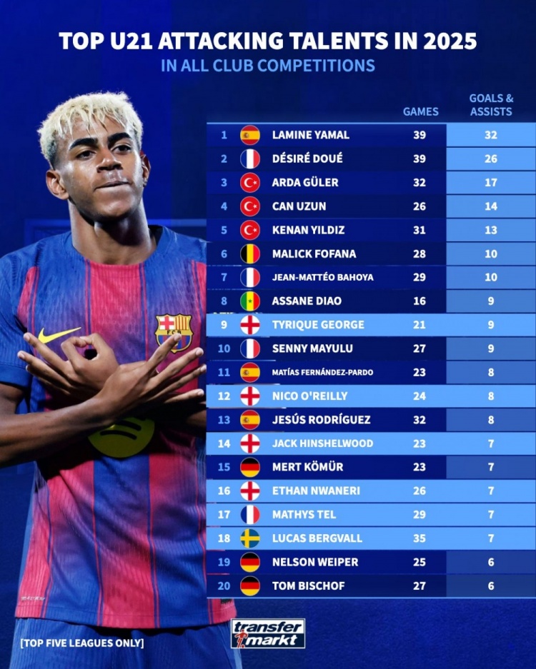 10月11日讯 德国转会市场列出了2025年五大职业联赛 U21球员加入 得分 榜,亚马尔32球居首,_英超直播免费高清直播_英超直播在线高清(无插件)-24直播网杜埃26球次席。