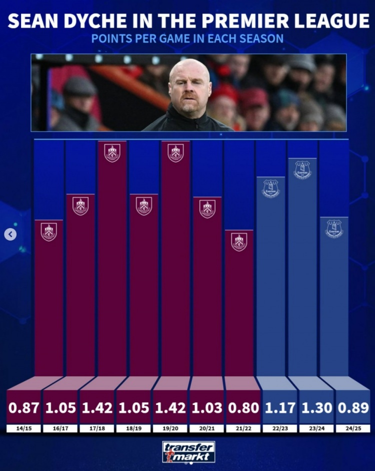 10月21日讯 戴奇正式执教诺丁汉森林,德转也盘点了戴奇此前执教伯恩利以及埃弗顿在英超的赛季场均积分情况,_英超直播免费高清直播_英超直播在线高清(无插件)-24直播网具体如下:
