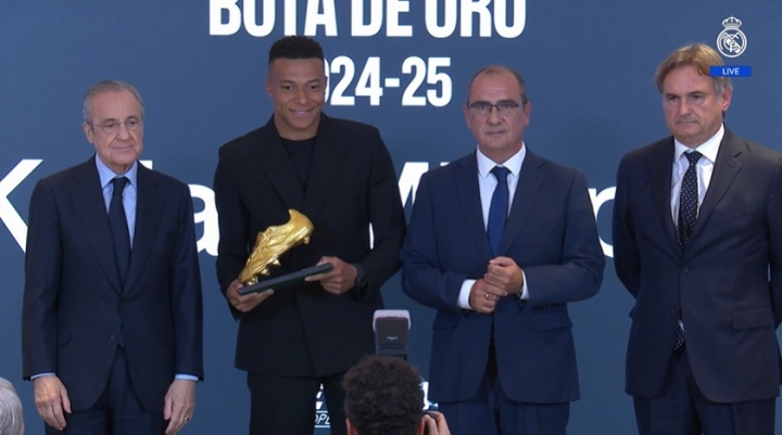 10月31日讯 姆巴佩在伯纳乌运动活动 场 贵宾室领取上赛季的欧洲金靴奖德甲新星川崎飒太的传奇之路杯。这是姆巴佩生涯首次斩获欧洲金靴,也是乌戈-桑切斯和C罗之后的皇马第三人。