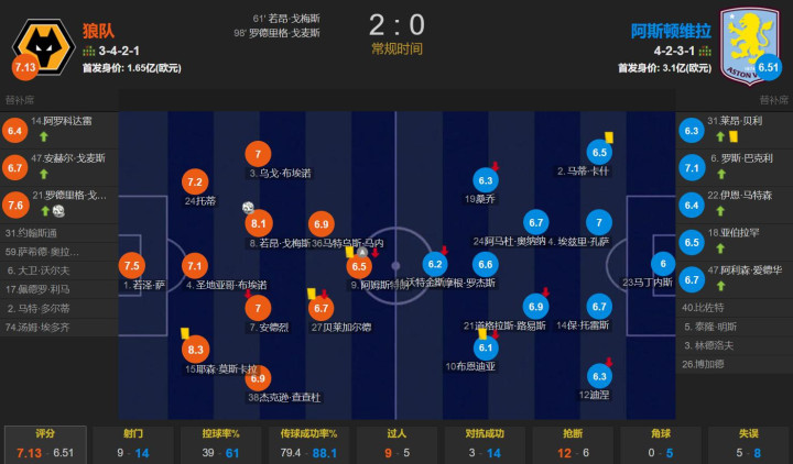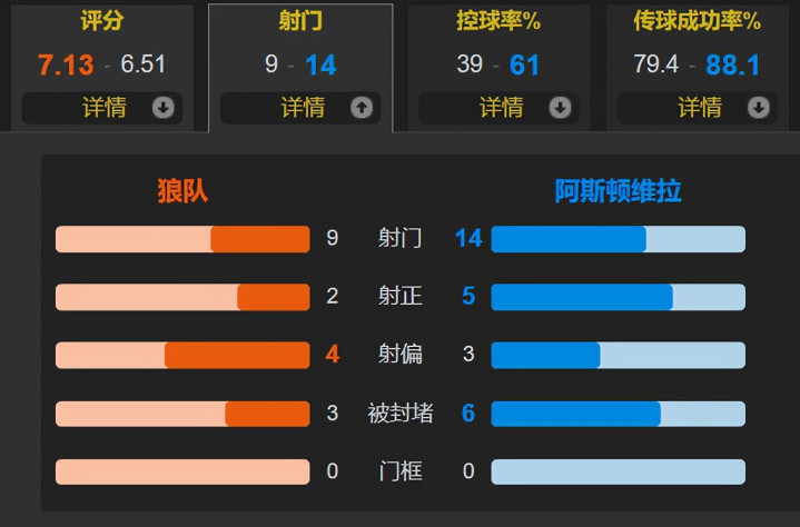 全场赛事 ,狼队的盘带时间 为39%,一共有9次射球 ,其中2次射正;阿斯顿维拉一共有14次射球 ,其中5次射正。狼队赢在效率高,2次射正就打入2球。