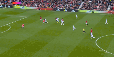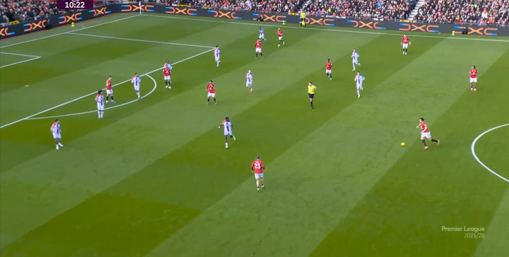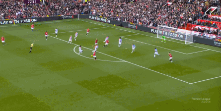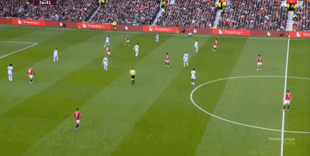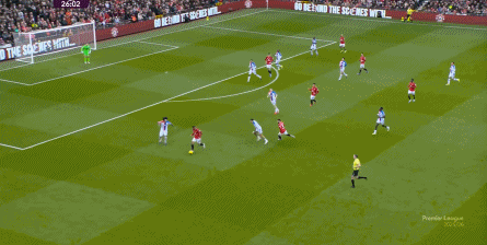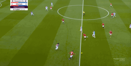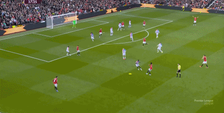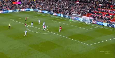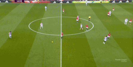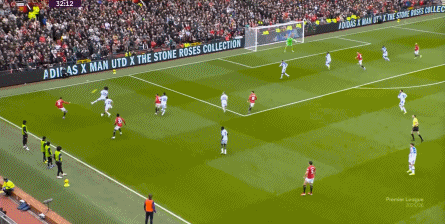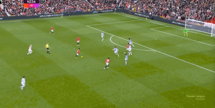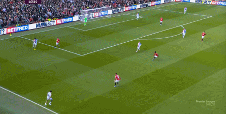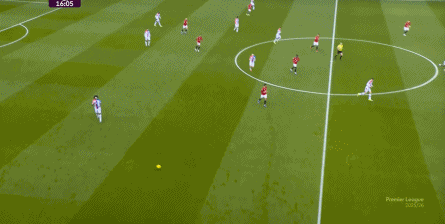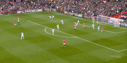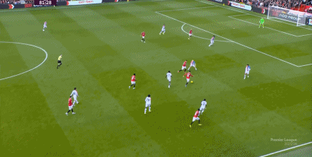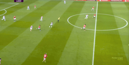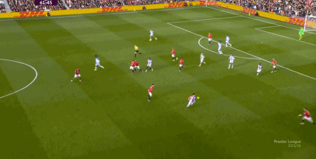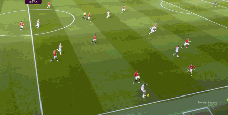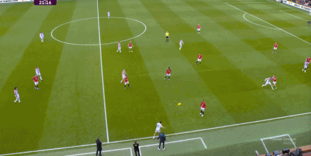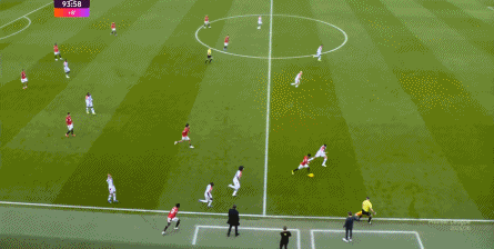 在这场赛事 之前,曼联的攻击 思路是充分拉高跑动量,让前场四人自由换位,甚至形成某个半扇或局部的集聚态势,这场赛事 也不是没有这样的例子,就像第11分钟,库尼亚便来到右路,和姆贝乌莫形成一前一后的站位,从而在右路送上传中: