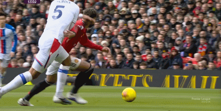 所以在第11分钟,水晶宫用长球考验马奎尔,后者出现和队友的连接错误 ,被水晶宫直接敲回来,萨尔先是用上肢保护自己,将球分给边路,自己再继续前插到马奎尔身后,打出了又一脚威胁射球 :