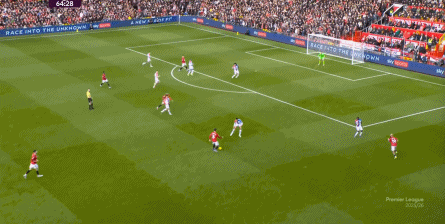 他不换位,库尼亚换位,就会形成站位上的彻底倾斜,这对于转换时的防卫 建制是一个不可忽视的问题,哪怕布鲁诺可以临时换到左路,但你指望超过31岁的他去覆盖超过30岁的卢克-肖的身侧,让穆尼奥斯在空位里的拿球不那么轻松,也是不现实的: