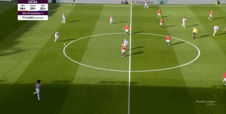 上半场后半段,受限于一周双赛带来的身体素质 问题,当然也有取得得分 之后的保守心态,水晶宫的表现就比较一般了,整体被曼联围住,打出的反制少之又少。